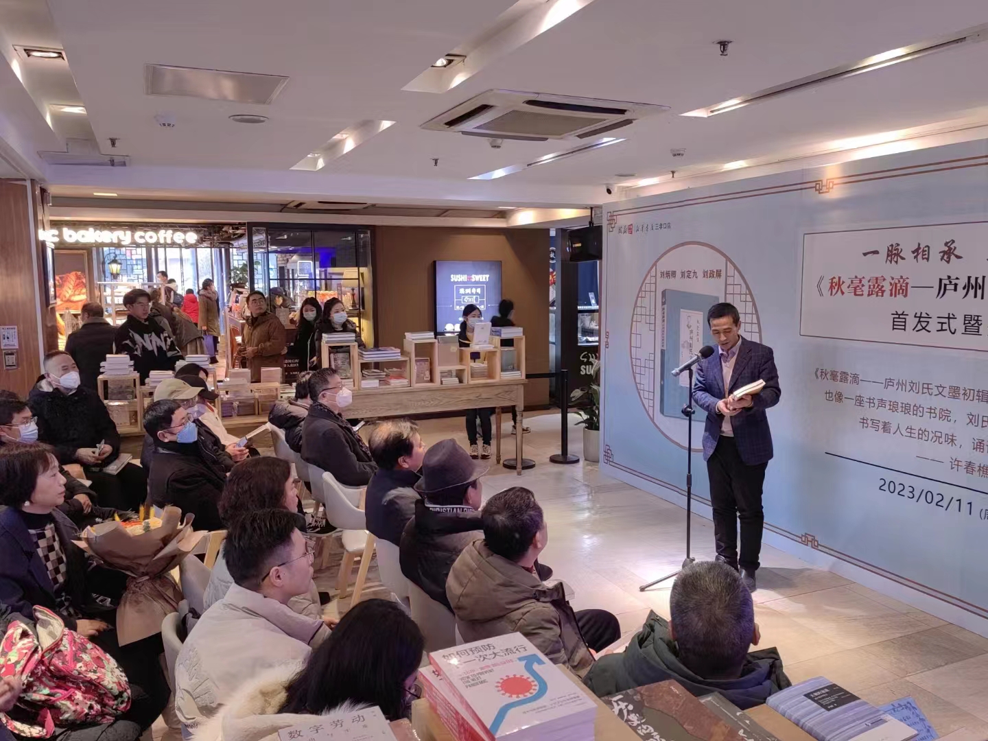 2月11日,《秋毫露滴——庐州刘氏文墨初辑》一书首发式在合肥市新华书店三孝口店举行。安徽师范大学出版社总编辑、副社长戴兆国,社长助理、营销中心主任王洁萍等参加了此次活动。活动邀请了安徽省文联副主席、安徽省作家协会主席许春樵,安徽省作家协会副主席洪放,安徽省作家协会秘书长李云,安徽知名语言学家王光汉教授等多位专家学者。《秋毫露滴——庐州刘氏文墨初辑》是安徽师范大学出版社近期策划的“庐州文化丛书”中的一本。该书收录了刘炳卿、刘定九、刘政屏祖孙三代人关于书法创作、文物收藏、文艺创作、地方历史文化方面的文章,由“刘炳卿集”“刘定九集”“刘政屏集”“附录”四部分组成,记述了绵延100多年家族文化的传承。书中还收集了与作者家族有关的诗文,这些诗文的创作者有省内外文化名家吴昌硕、李审言、马其昶等,大部分资料为首次公开。这本书的出版,对合肥地域文化研究、家族文化研究、书法文化研究、戏剧文化研究,都具有重要的参考价值。